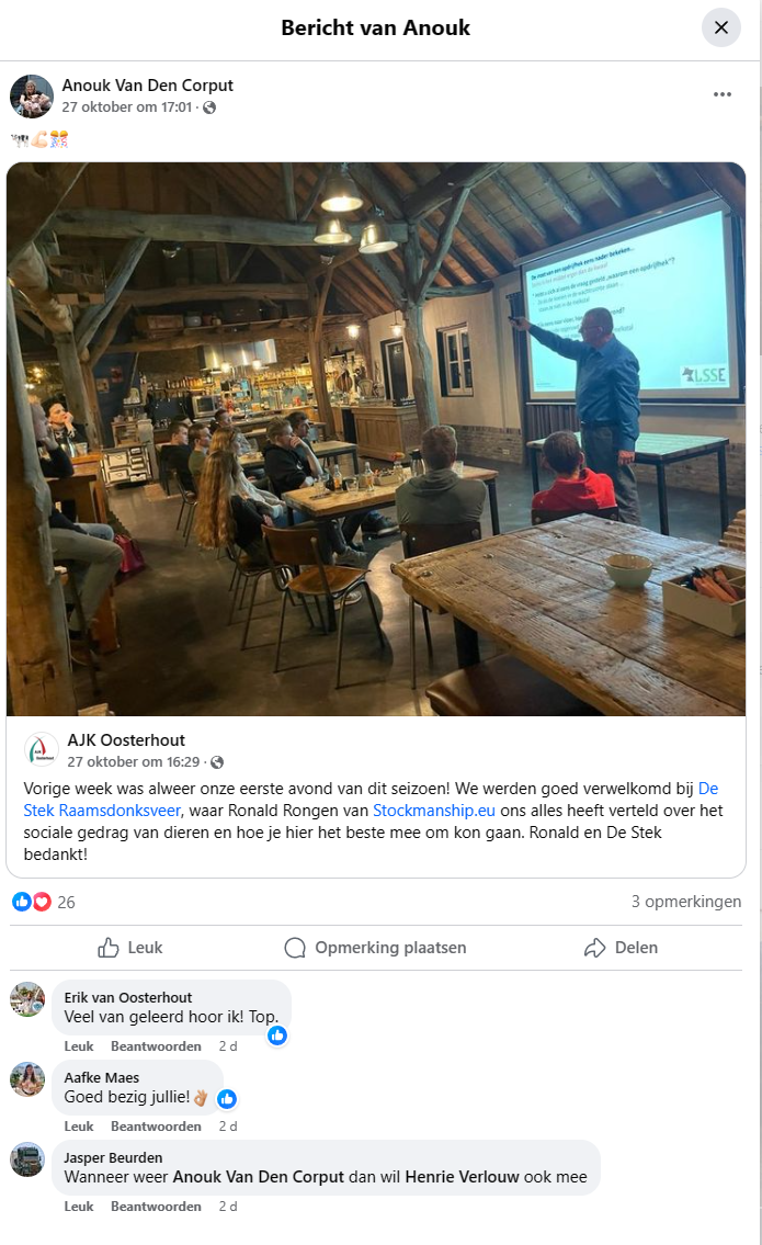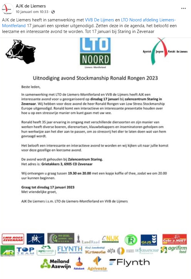 Agrarisch Jongeren Kontakt "de Liemers", in cooperation with "Vereniging voor bedrijfsvoorlichting de Lijmers" and "LTO Noord department Liemers-Montferland", organized an informative evening on January 17 for their members about the theme Low Stress Stockmanship in Dairy Farming.